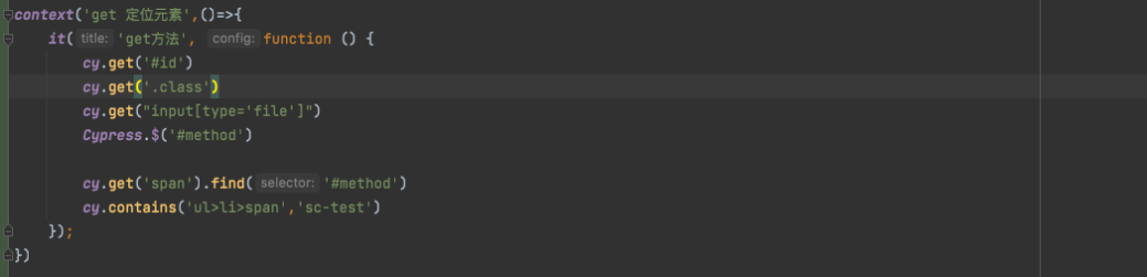 对于普通方式难以定位的元素,cypress 还提供了 JQuery 选择器:Cypress.$(selector) 等同于 cy.get(selector)
