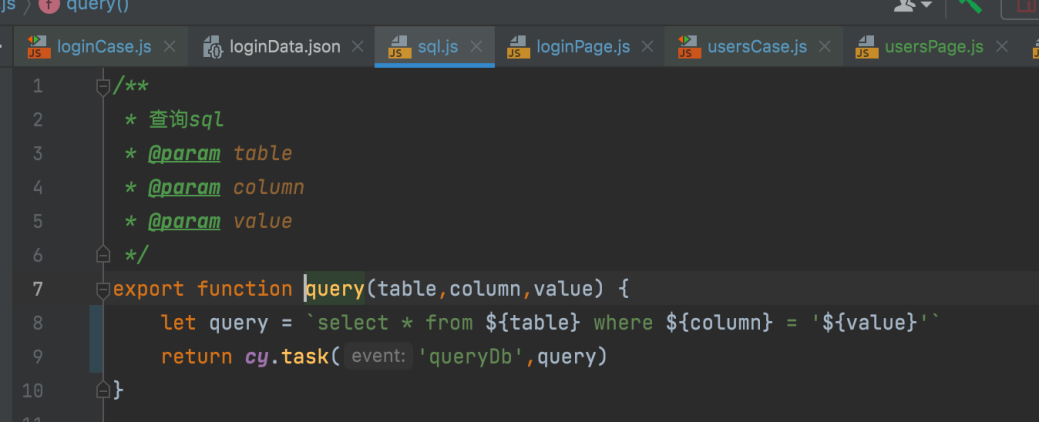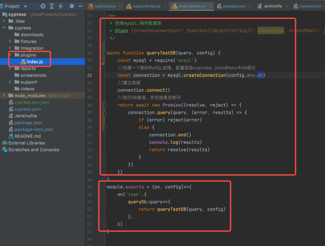 在plugins目录下的index.js中添加task函数来传入sql语句和数据库信息,创建queryTestDB函数来连接数据库,该步骤类似JDBC连接数据库。