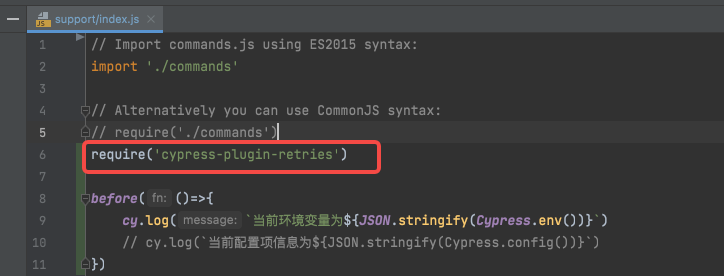 在cypress/support/index.js文件中添加import './commands'