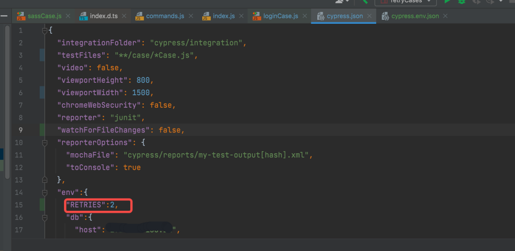 最后在 cypress.json中env 下配置 RETRIES 重试次数,这样用例失败后就会重新执行,重试只针对失败的用例。