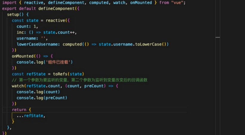 可以通过直接导入 onX 函数来注册生命周期钩子,放在 setup()函数内使用。computed 接受一个 getter 函数,并根据 getter 的返回值返回一个不可变的响应式 ref 对象;或者,接受一个具有 get 和 set 函数的对象,用来创建可写的 ref 对象。watch 侦听器数据源可以是一个具有返回值的 getter 函数,也可以直接是一个 ref。