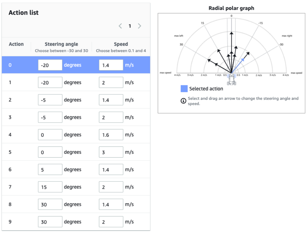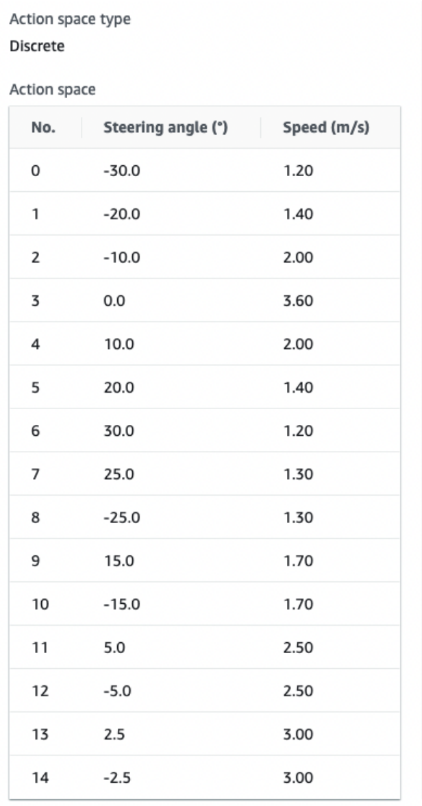 Action Space 有连续性和离散型两种,连续型即我们只需要选取速度和转向角度的上下界,离散型则是我们需要对 Action Space 进行手动设定,如下是我们其中一个模型最终的 Action Space 的设置结果。