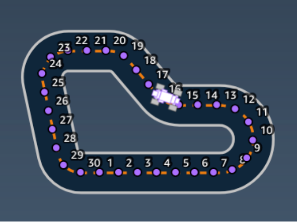 我们在实际开车的时候,通过会以远方的某个位置为参照来做加减速和转向的操作,而不会看自己的车离路两边或中线有多远,这个策略就是一个对真实开车的模拟。赛道被划分为了很多的 waypoints,车在行驶过程中,对车到最近的 waypoint 的连线与车当前行进方向间的关系进行比较,来调整车的动作选取。