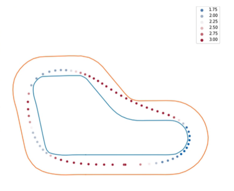 我们在设定 Action Space 的时候,主要参考了场地情况,场地有一个很大的需要左转的弯,所以我们需要设定能左转很大的 Action,另外在走直线的时候我们希望车可以尽量快速,所以在 0 度的位置,我们设了一个较大的速度。