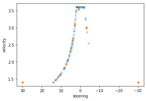 在另一个策略里,我们没有针对赛道左转较多而作优化,而是考虑到速度与转弯在车辆行驶过程中的不完全独立,为了简化 Action Space,我们做了在同一个转弯角度上只有单一速度的设定。