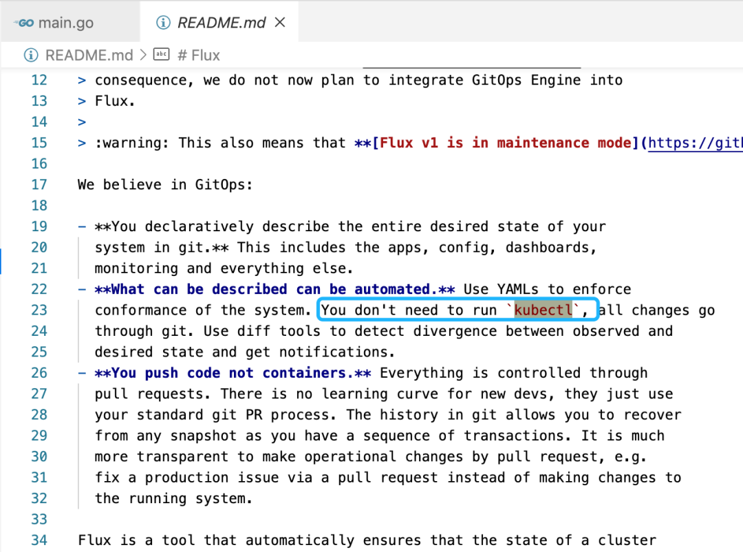 上面是 Flux 的源代码的 README,从这里可以看到,Flux 将 kubectl 包裹了起来,fluxctl 所做的事情,其实就是由 flux 来根据声明式的配置定义来完成的,而 fluxctl 的方式就是 iperative 的方式,是传统的方式,而 flux 的方式是 declarative 的方式,是声明式的方式,符合了 IaC 的原则,至此,整条链路达成了一致。