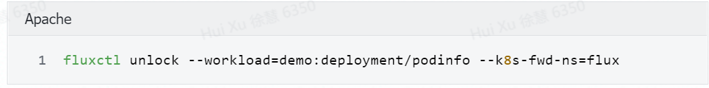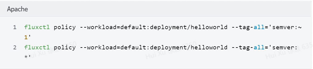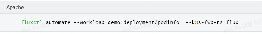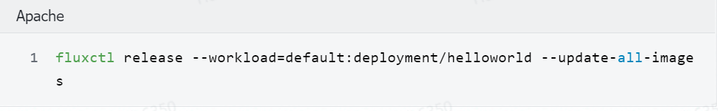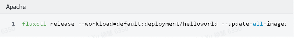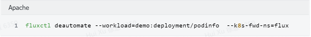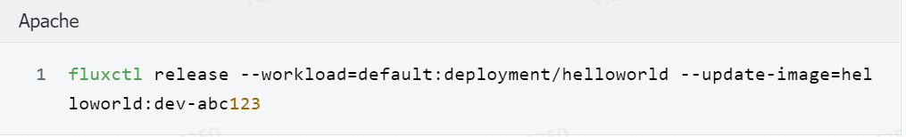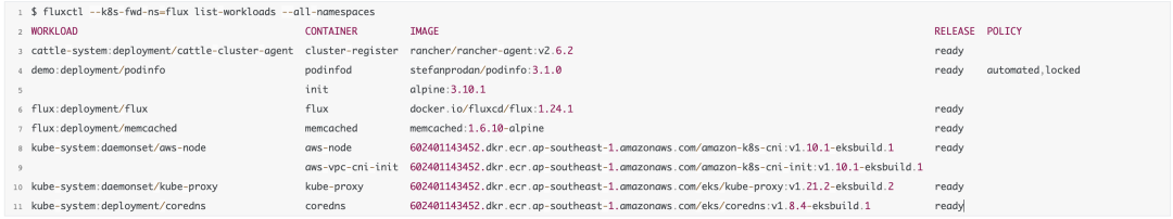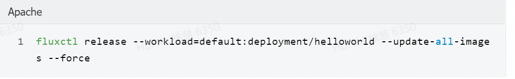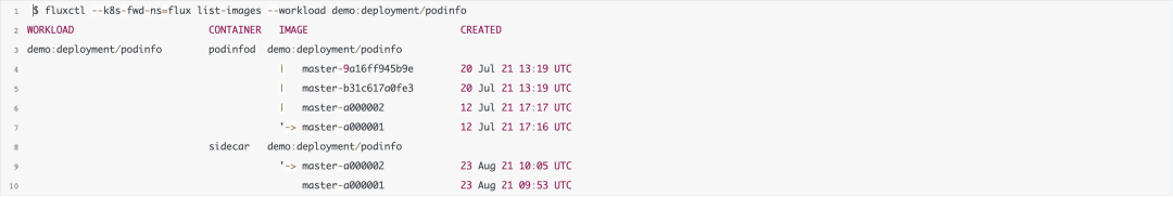 # 查看容器版本 fluxctl --k8s-fwd-ns=flux list-images --workload=demo:deployment/podinfo # 关闭自动部署 fluxctl deautomate --workload=demo:deployment/podinfo --k8s-fwd-ns=flux # release 部署到指定回滚的版本 fluxctl release --workload=demo:deployment/podinfo --k8s-fwd-ns=flux --update-image=quay.io/weaveworks/helloworld:master-a000001 |