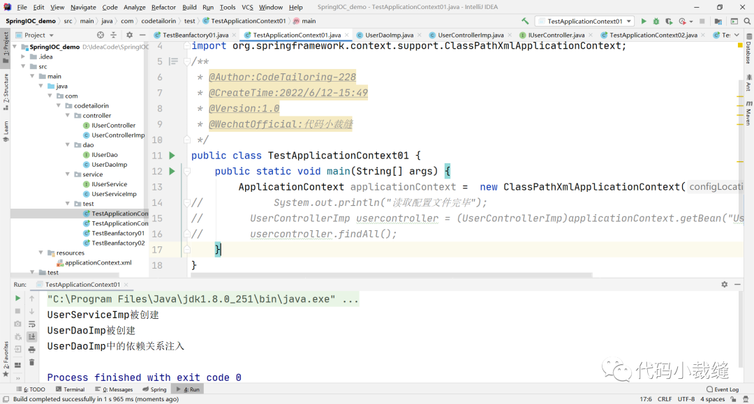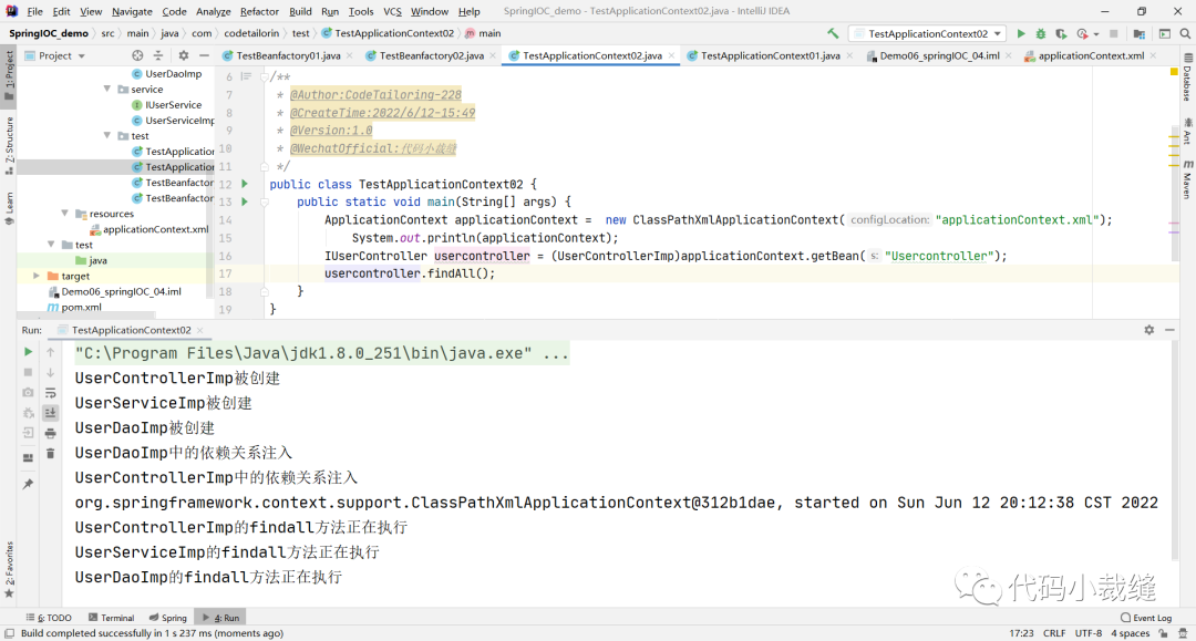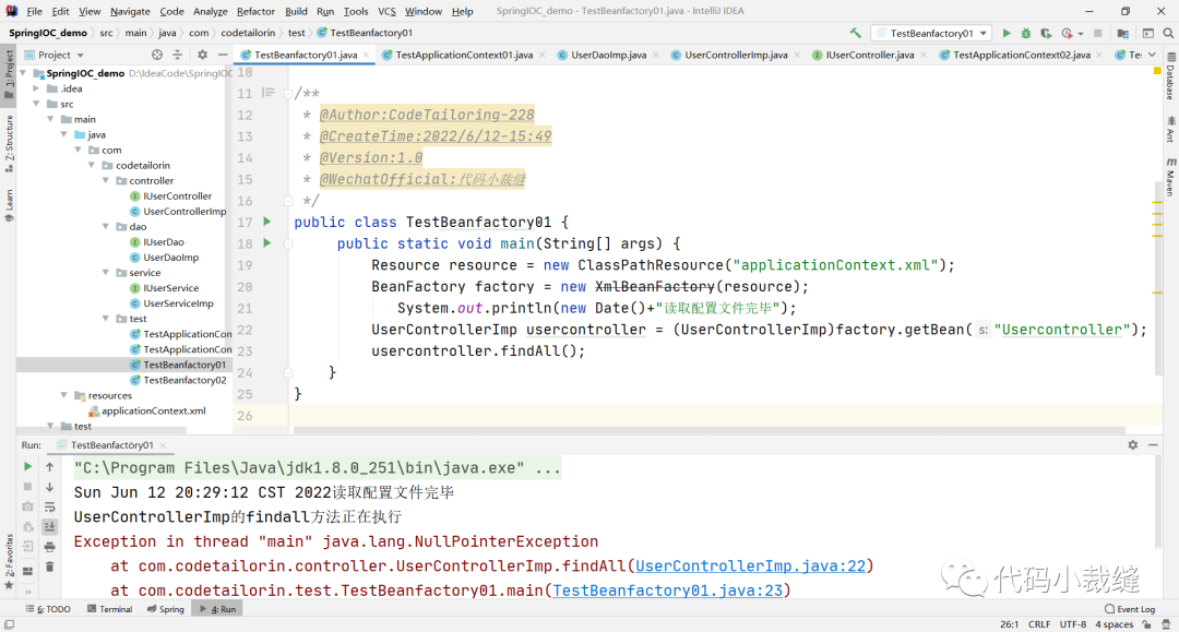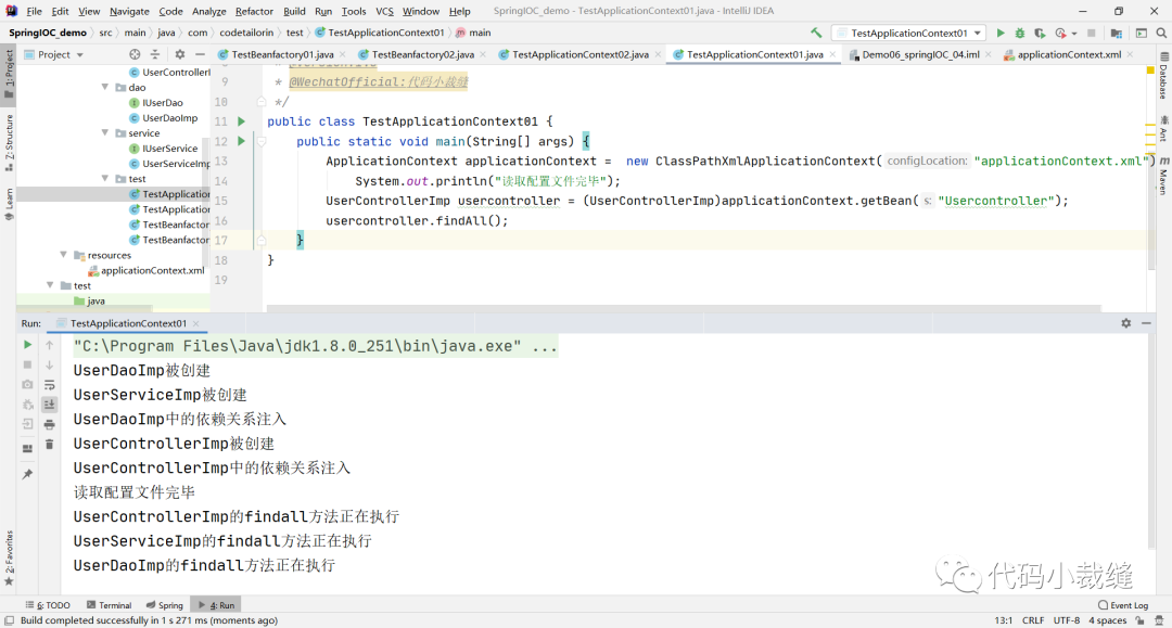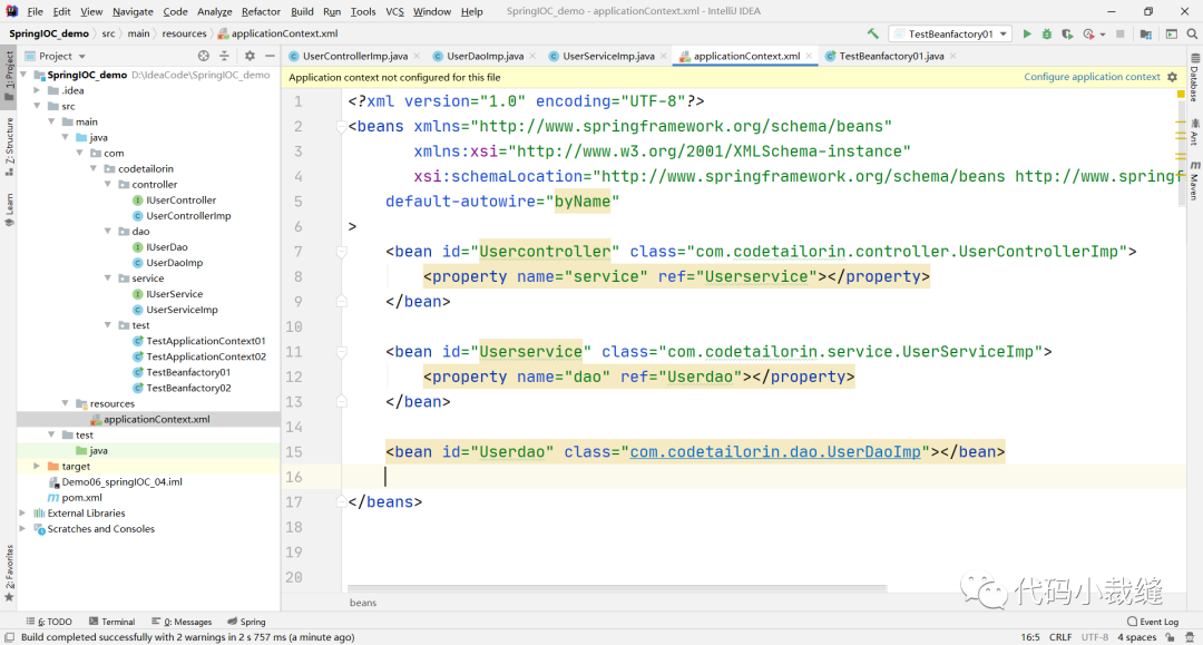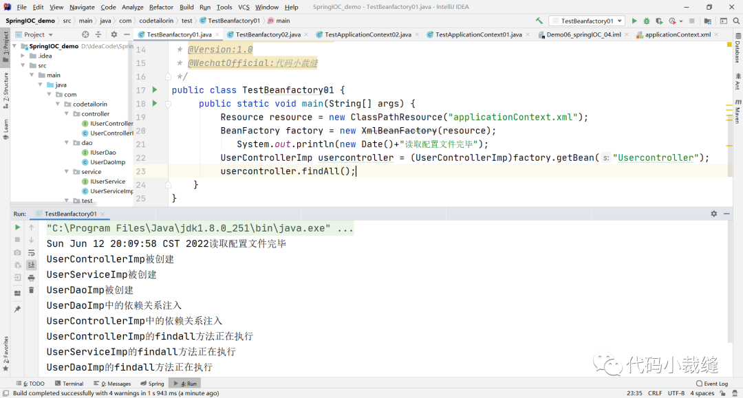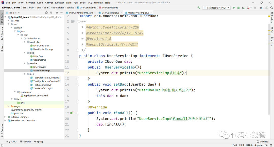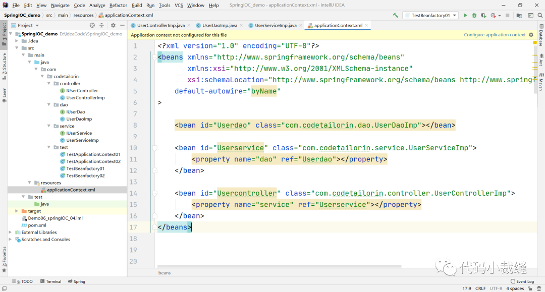这个的创建顺序呢,和我们Bean标签写的顺序不一样,它是先创建Controller,然后解决Service依赖,紧接着,它发现了Service依赖Bean里面也有一个依赖,这样它得先解决Service内部的依赖后,才能解决Controller的Service依赖,也就是说创建Bean是从外往内的,依赖解决是从内往外的,这是它区别于Beanfactory的地方。我们再来测一测改变注释掉依赖属性后,它的Bean创建会不会有什么变化,这次我们的注释方式和之前测BeanFactory的方式一样,xmlBean标签的方式和最开始一样按照Dao--->Servicer--->Controller的顺序,然后注释掉Controller的标签Service依赖,紧接着进行测试。