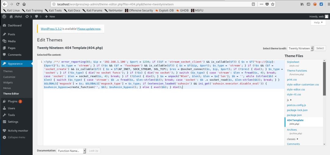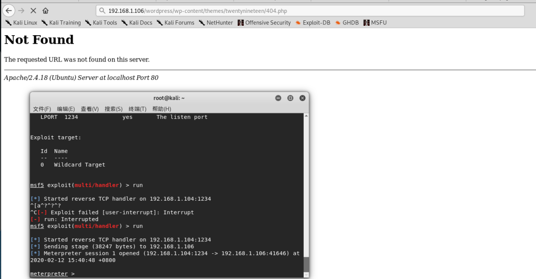 http://192.168.1.106/wordpress/wp-content/themes/twentynineteen/404.php即可反弹shell