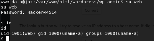 发现一个用户叫web,之前wordpress得到一组用户名密码就是web的,于是尝试切换用户,没想到成功切换了。(做到这里发现,之前完全可以通过ssh直接登录,也就省略了反弹shell的步骤,不过要不是凑巧账户密码一样也不能成功,所以这里说明账号口令尽量不要设置成相同口令,然而事实上我们很多口令都是设成一样的,警示!)