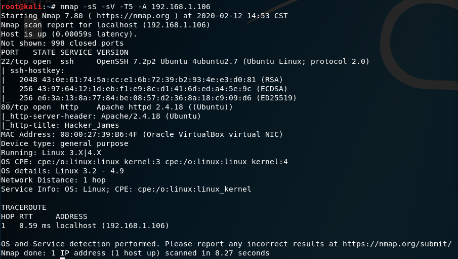 端口探测及服务识别:nmap-sS -sV -T5 -A 192.168.1.106