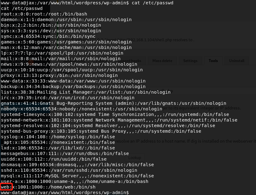 看来这就是wordpress的用户名密码了。(其实到这里已经可以走捷径了,后面提权的时候才发现,这里可以直接使用ssh登录进去)登录进去后发现该用户权限挺大的。