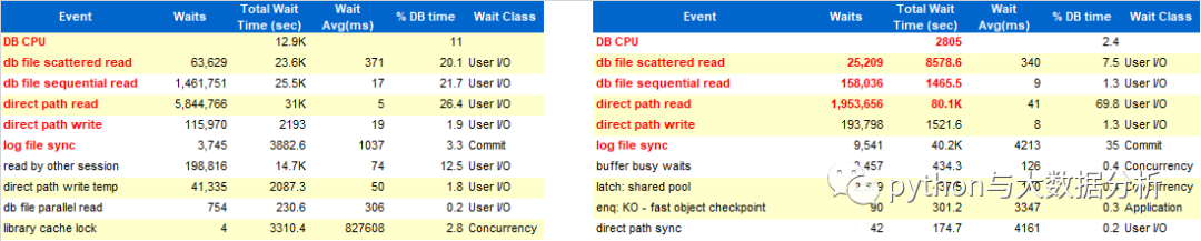 关于Top 10 Foreground Events by Total Wait Time中,db file scattered read和db file sequential read、direct path read and write都下降了很多。