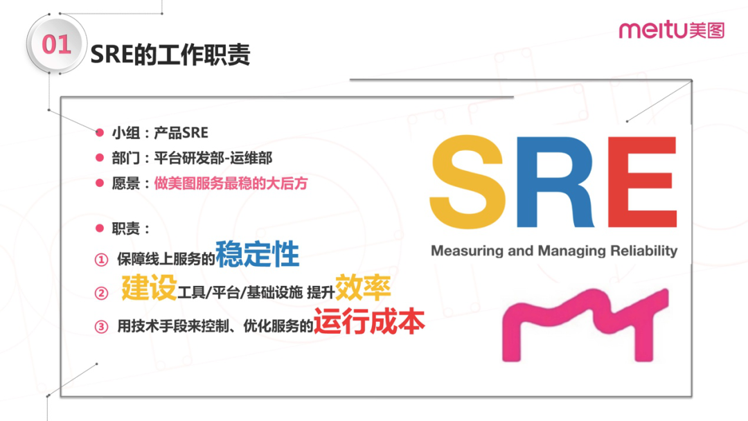 同样的岗位名称,在不同公司的具体职责和目标可能会有些差异,这是我们在美图的职责定位:我把SRE的核心目标归结为3点:稳定性、效率和成本。