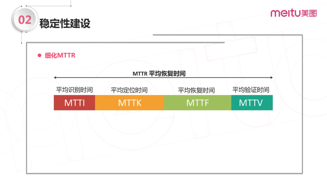 为了更好的理解和掌控故障恢复这个阶段,我们对MTTR做进一步拆解;根据时间顺序,MTTR可以细化为MTTI、MTTK、MTTF、MTTV四个阶段(指标)。