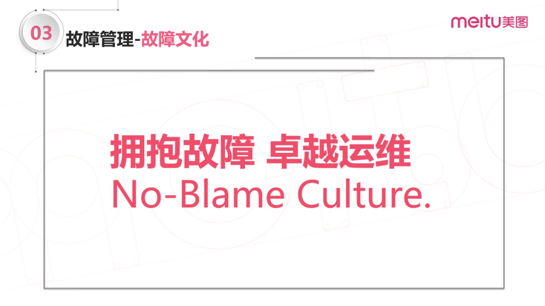 这是我们基于No Blame Culture得出的公司内部的故障文化的标语:「拥抱故障,卓越运维」,我们希望在这样的基调之下去做开展故障管理的工作。