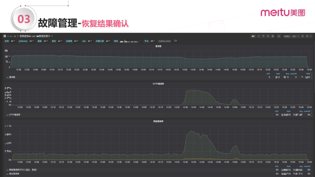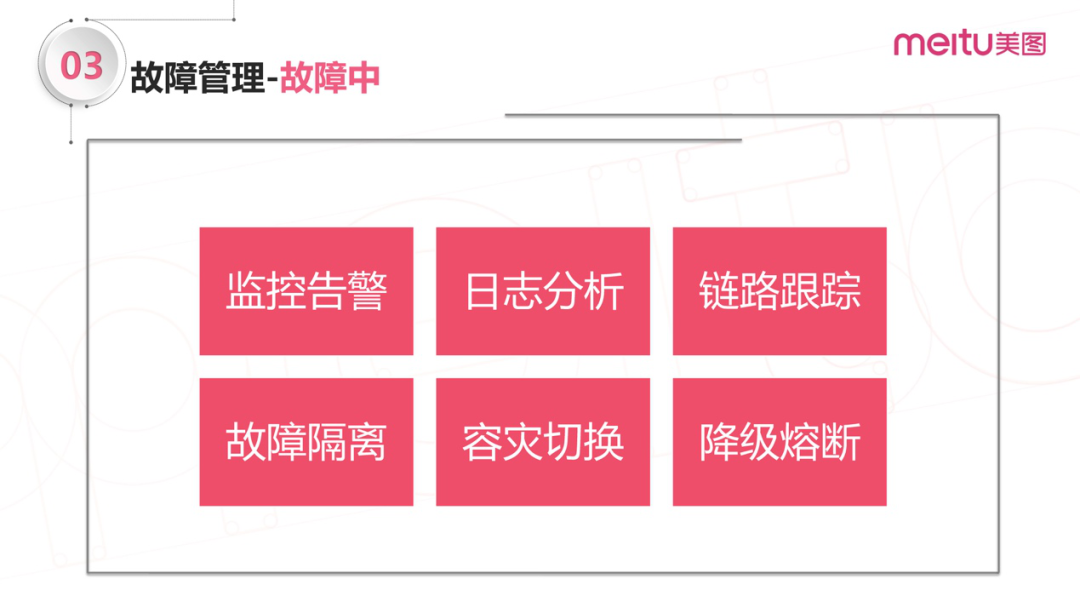 故障中:发现、定位、解决故障;目标是尽可能的提高效率,缩短故障恢复的时间;