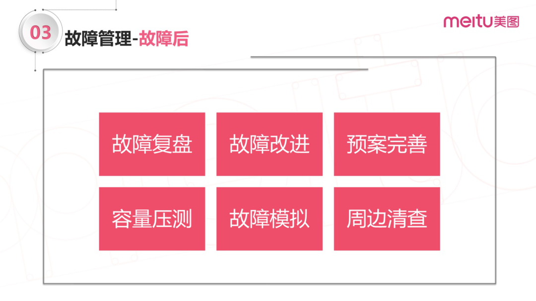 故障后:故障复盘、故障改进;目标是尽可能多的从故障中吸取教训,反思和学习,完善和修复故障中暴露出来的问题。