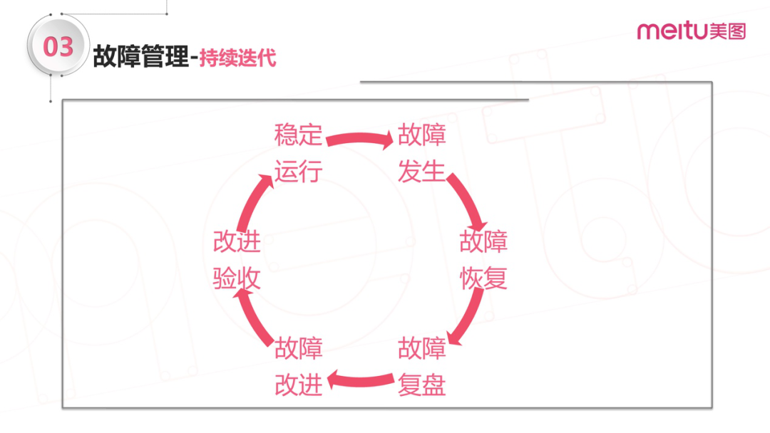 到此做个总结,故障本质上是持续迭代的,当故障发生了,开始恢复、复盘、改进、验收,回到稳定运行的状态,再过一段时间又出现故障。同时,服务也持续地迭代,因此要不断去提升稳定性,这是我们都逃不出的一环。