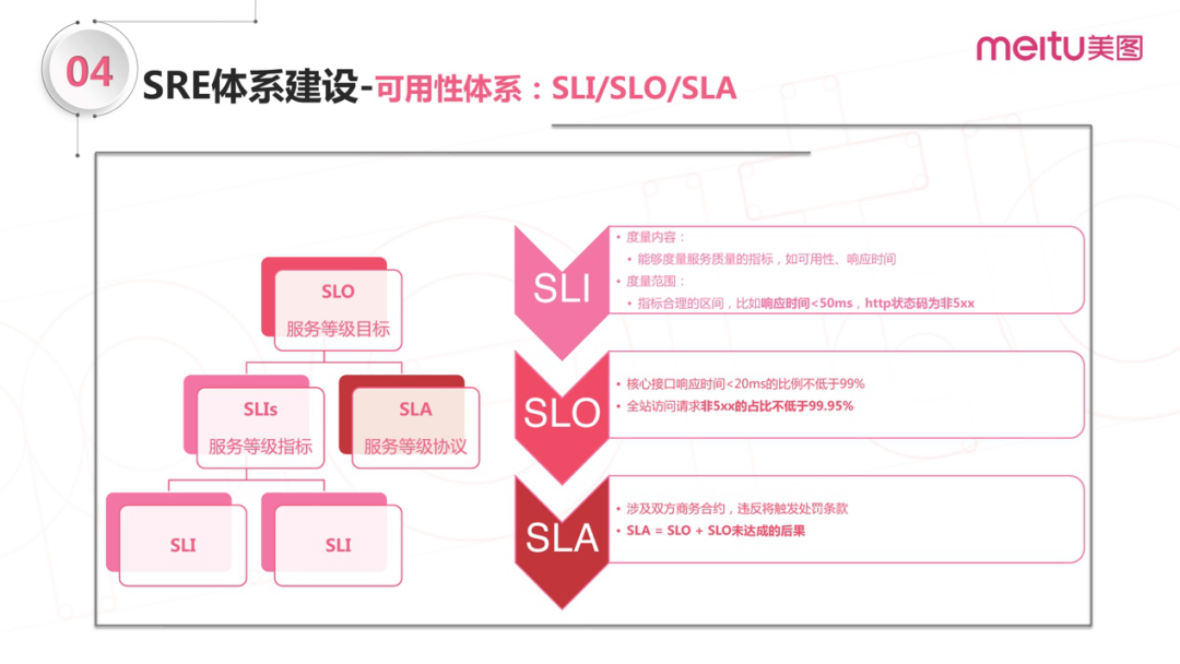 关于可用性体系里面的三个名词需要达成一致的理解。平时我们所讲的SLA并不是真正意义上的SLA。SLI是指标,SLO是目标,SLA是我们的目标加上目标未达成的后果,通常运用在双方一些商务合约上,例如使用某云厂商的服务,对方承诺可用性不低于99.95%。一旦没有达到我的要求,处罚性的或者赔偿性的一些条款将会生效,这才是真正意义上的SLA。