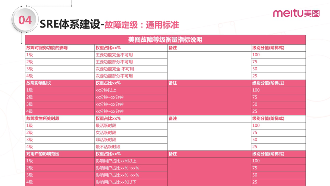这张图列出的故障等级衡量指标是非常具备参考性的,可以基于此建设自己的故障等级体系,看看用哪些指标来衡量故障的影响,从而给服务定级。图中列出四点都是常规的考核项,主要看对服务功能的影响、影响时长、故障所发生的时段、对用户的影响范围。对用户影响范围就是看是主要功能还是次要功能不能使用,大概会算出权重占比。