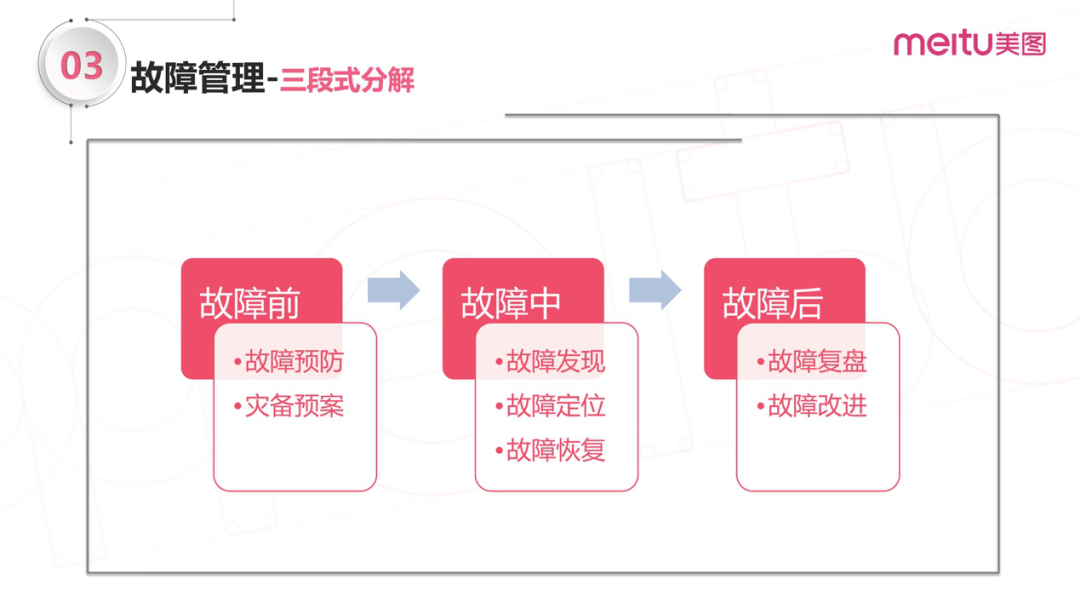 根据故障发生的时间顺序,我们把故障管理分为故障前、故障中和故障后,在每个环节都有一些核心的工作内容和目标。