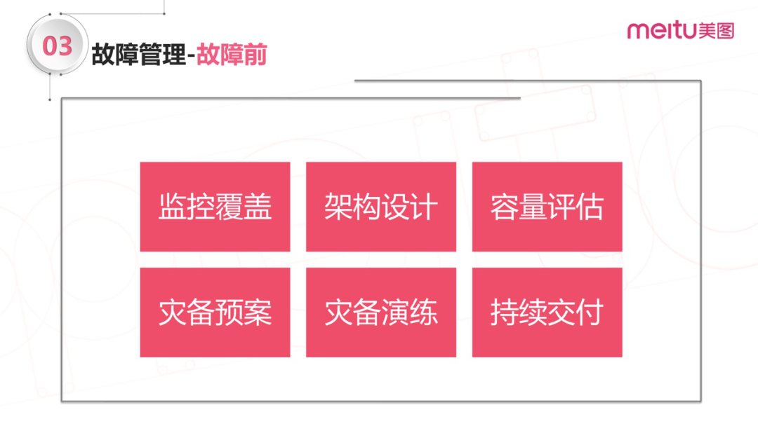 故障前:故障预防、灾备预案;目标是尽可能地做足准备工作,毕竟有背方可无患;