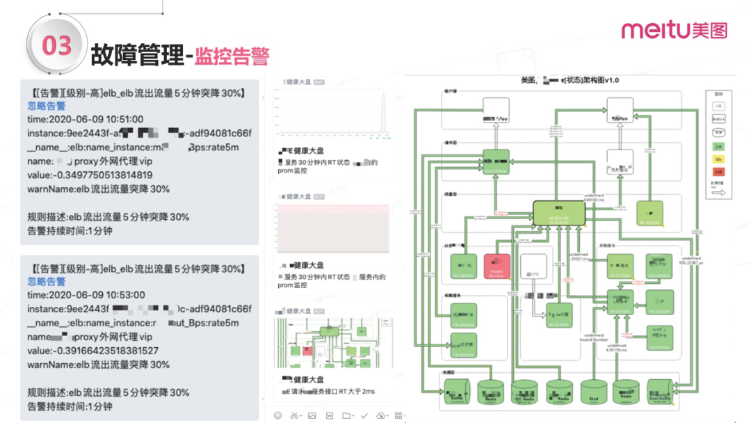 最右面的图看起来比较酷,它是怎么实现的呢?它的意义是什么?对比前面这两张文字图,文字图只是告知流量突降30%,这是一种告警方式。中间的图就是由名为“监控大盘”的机器人发送出来的,也是我们服务的架构图。放大图看,我们的业务模块、交互链路已经暴露出来了;图中有一块是红色的,红色代表标识异常,与异常关联的某个组件就变成淡绿色。