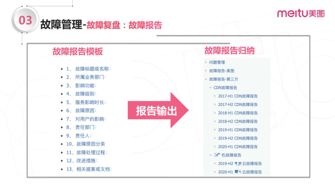 这是故障解决后绕不开的一点,在故障发生后都会做一个报告,上图就是我们内部的一个故障报告模板。在报告里面写清楚故障级别、责任人、处理过程、改进措施,将这些关键点归纳成故障报告的文档。
