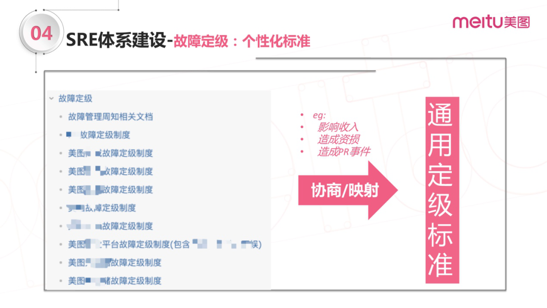 除了通用标准,还有一些没有被囊括到体系中来,比如某些电商类、商业化、广告类和金融类的业务,有可能造成资产损失,那么不同的部门会有不同的故障管理的定级策略。为此,我们要把这些不同部门的体系映射到通用的定级标准里面,以便更好地管理。