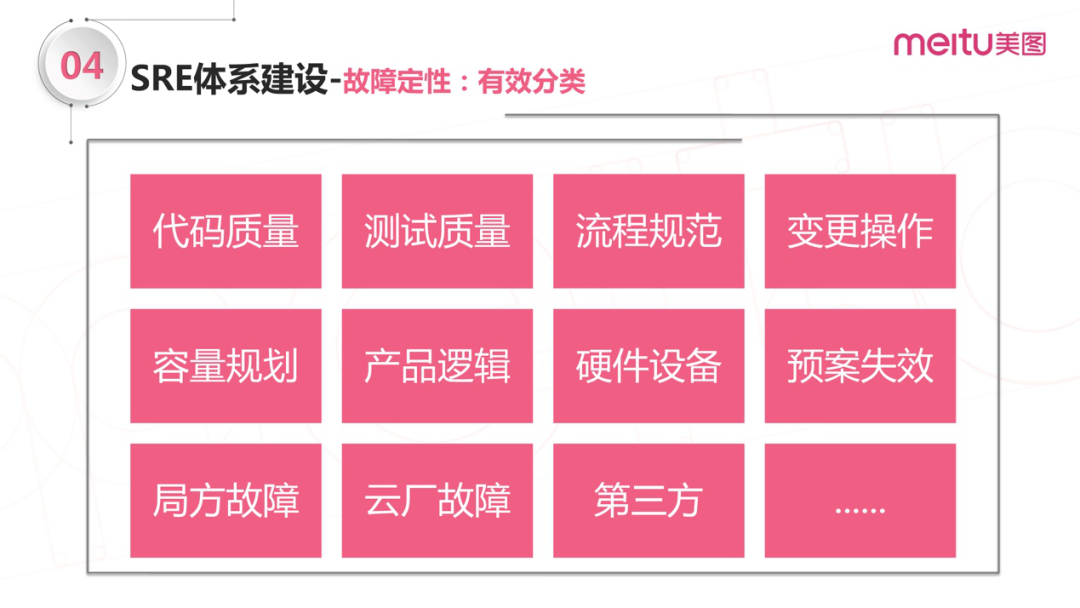 上图是故障定性的一些有效分类,即定性故障是由什么原因引起的。是代码质量、测试质量、流程规范出了问题,还是变更操作不够规范呢?还有其他种种原因,我们要对故障做定性的分析和归类。