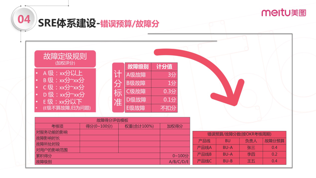 在SRE里经常听到错误预算,如何做到实际落地?前面讲了故障的定级规则,明确定级规则之后,不同的故障被定为ABC级,按对应计分标准扣分。扣的分数来源于给出的预算。我们每半年为一个OKR考核周期,在一个考核周期里面每个BU会分到一定的故障分,允许在考核周期里由于故障被扣分,如果分数扣完了意味着错误预算用完了。这里提到的和Google SRE类似,即可用性达到多少标准,发布将受到限制。我们将错误预算和OKR做了绑定,让大家在目标驱动之下达成这个目标。