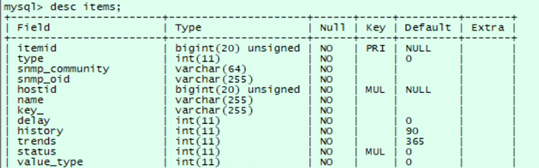存储所有监控项,利用hostid在items表中查询该主机有那些监控项,itemid为监控项的id,name为监控项的名称,key_为键值,也就是表达式,怎么对监控项取值。