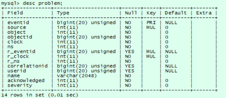 SELECT p.eventid as 事件id,FROM_UNIXTIME(p.clock,'%Y-%m-%d %H:%i:%s') as clock,p.name as 触发事件,p.severity as 事件等级 FROM problem p WHERE p.source='0' AND p.object='0' AND NOT EXISTS (SELECT NULL FROM event_suppress es WHERE es.eventid=p.eventid) AND p.r_eventid IS NULL ORDER BY p.eventid DESC LIMIT 10;