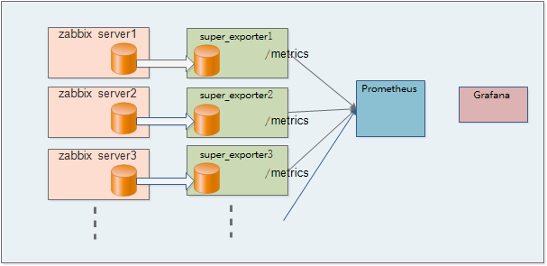 为了解决zabbix存在的不足,我们进行了zabbix和Prometheus融合监控项目,通过为每套zabbix数据库开发部署一套super_exporter,定期从数据库抓取该zabbix下的所有监控服务器性能数据,上报给Prometheus。为了减轻主数据库压力,提升响应速度,为每套zabbix新增一个独立从库,专门为super_exporter抓取数据使用。