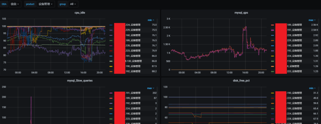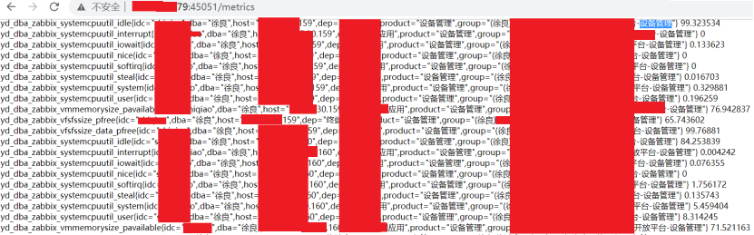 Metrics返回该zabbix管理的所有监控主机对应的多个监控项性能指标,涉及dba,host,产品部门,产品,集群,机房等标签。