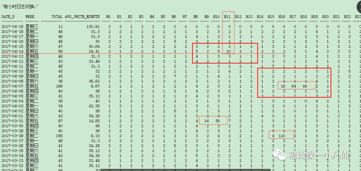 从这个日志归档切换来看, 2017-04-14日11点产出10个归档,是整个一天最大的量。如果说因为切换太频繁导致阻塞的话,就说不过去,虽然11G默认安装3组日志,每组50MB,平时25MB切换一下。可你看红色框的其他时间点切换也很频繁的。尤其是我在做索引重建压缩时产生110个归档日志,也没报警阻塞了交易业务。
