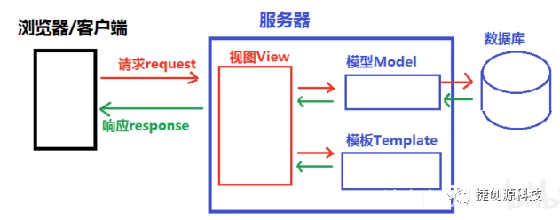 V视图层(View)是核心,负责接收请求、获取数据、返回结果。