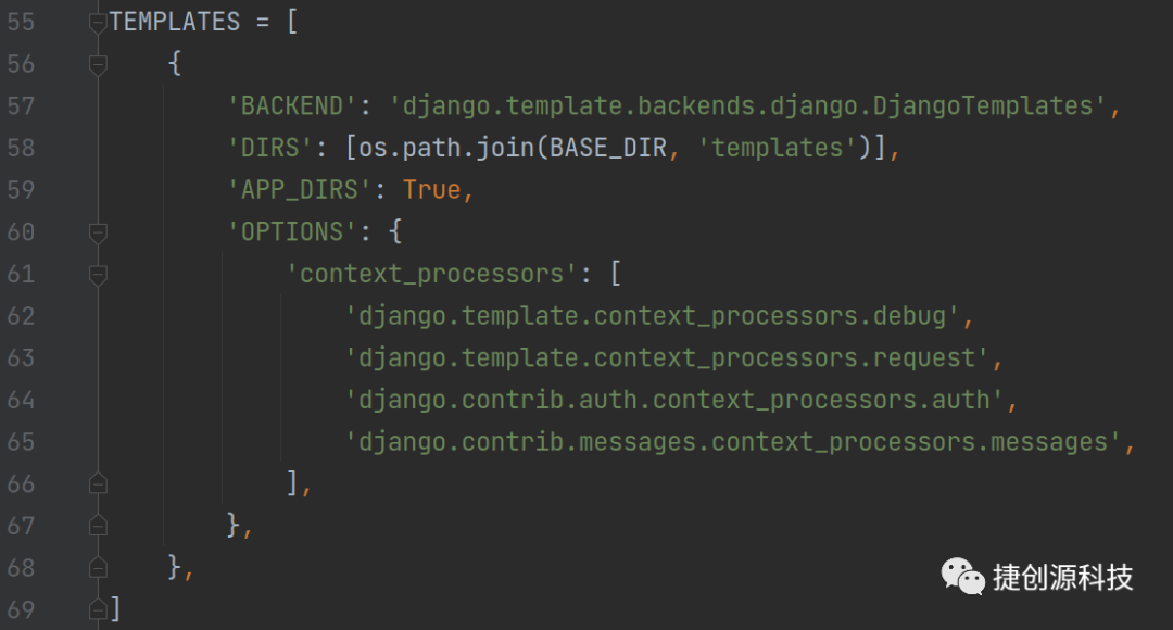 BACKEND:指定模板的引擎。 DIRS:模板的搜索目录(可以是一个或多个)。 APP_DIRS:是否要在应用中的templates文件夹中搜索模板文件。 OPTIONS:有关模板的选项。
