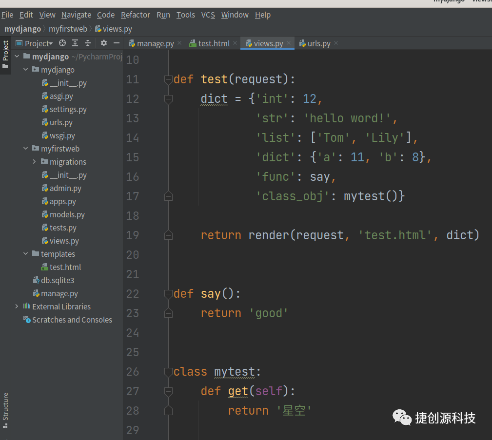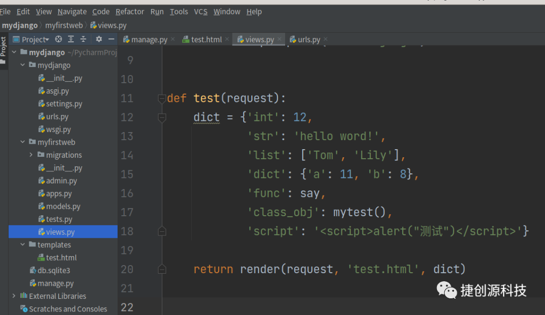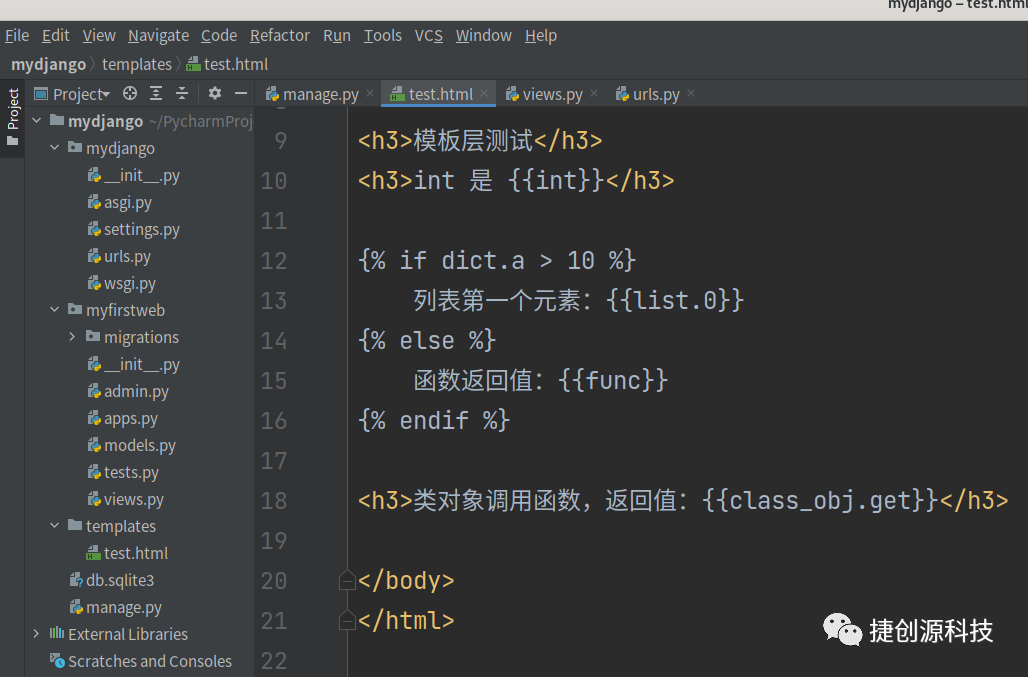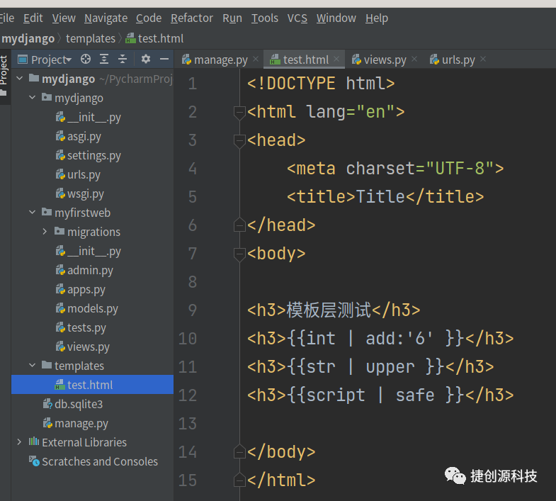 1.创建django工程mydjango,使用PyCharm打开该工程,创建模板文件夹templates,添加模板文件test.html