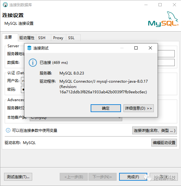 会下载MySQL驱动文件,再次测试连接,出现连接成功提示。