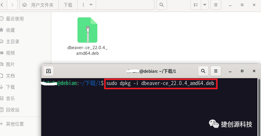 打开下载的DBeaver文件(后缀格式.deb包)的文件夹,打开命令终端,输入下面命令安装,如下图示: