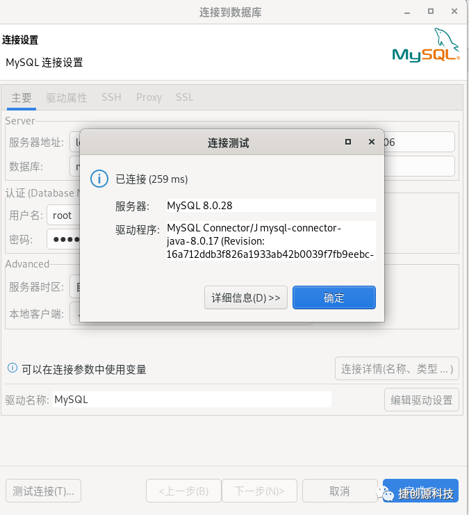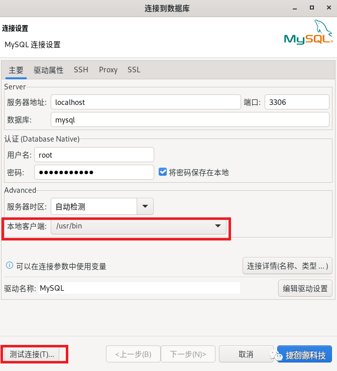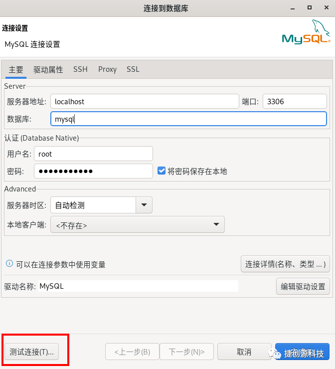 3.输入数据库名称mysql,用户名和密码,进行连接测试。