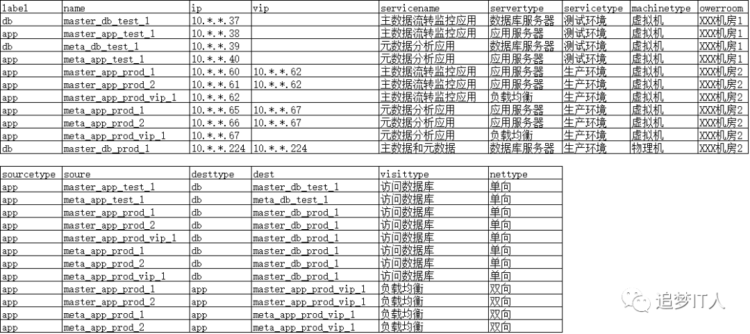 前两个部分尝试了一下neo4j和py2neo的基本语法,证实了图库在运维实体中实现的可行性,先对数据结构做了一下调整,在服务器节点上增加了label,主要用来区别数据库还是应用服务器,在访问关系中也增加了源和目标的label值,主要是考虑到数据库和应用还是有很大区别的,数据库可以是多个业务系统的数据库,数据库本省也存在RAC、Dataguard、VIP、物理IP、ScanIP等多个概念,目前还没完全构思好,暂且只是简单分一下类。