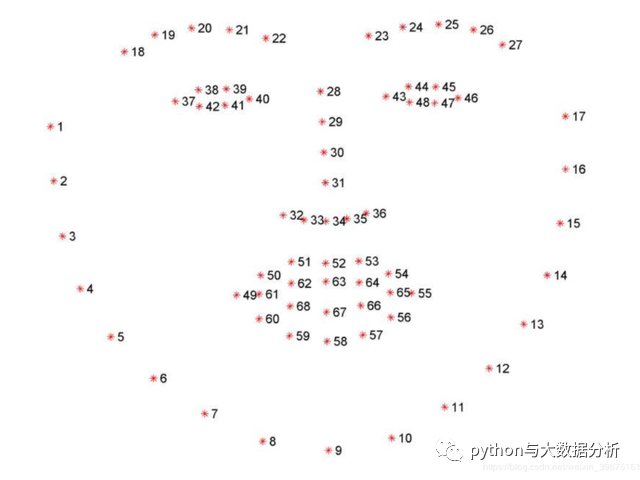 dlib库采用68点位置标志人脸重要部位,比如18-22点标志右眉毛,23-27点标志左眉毛,37-42点标志左眼,43-48点标志右眼,32-36点标志鼻子,49-68标志嘴巴,这其中还可以识别嘴唇。