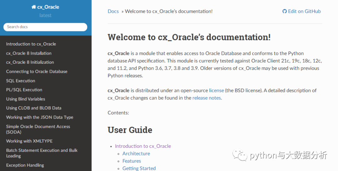 Oracle的官方文档一直是最全的,从高阶的到底层,从数据库、中间件、云计算等无所不包,cx_Oracle的官方文档也是秉承这种风格。