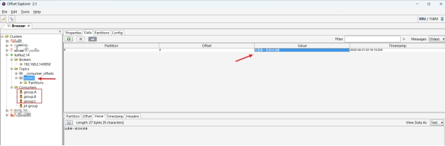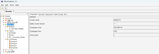 - 通过Offset Explorer可视化工具也可以查看到对应TOPIC下的消息,以及创建的消费组。