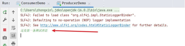 - 运行ProducerDemo.main(),该类创建了一个生产者并持续接收控制台用户的输入作为消息内容,并向消息主题DEMO发送消息。