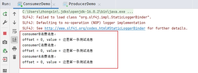 然后查看ConsumerDemo页签查看各消费组消费的消息信息,可以发现三个消费组都消费了同一个主题信息。
