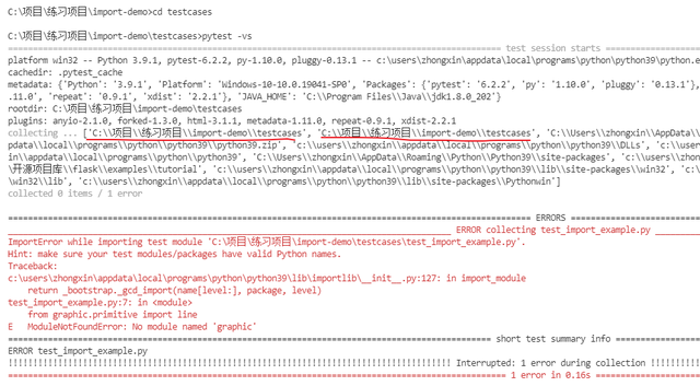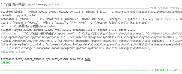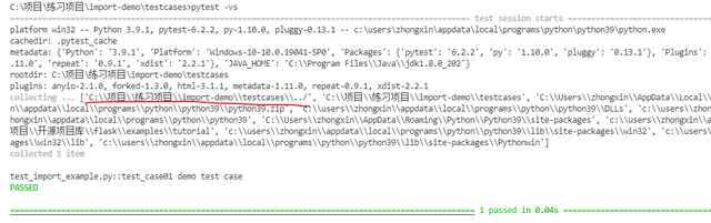 再次执行pytest命令(这次加了-vs参数以便查看到打印信息),可以正常导入模块了,划线的记录是加入的环境变量记录